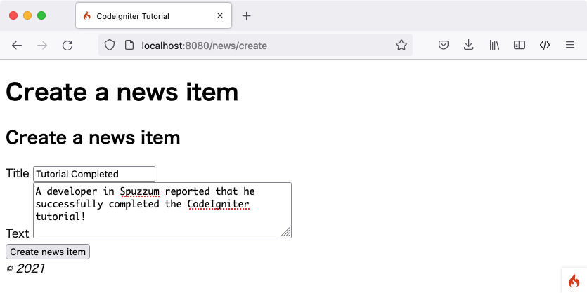 After this, a view is loaded to display a success message. Create a view at app/Views/news/success.php and write a success message.